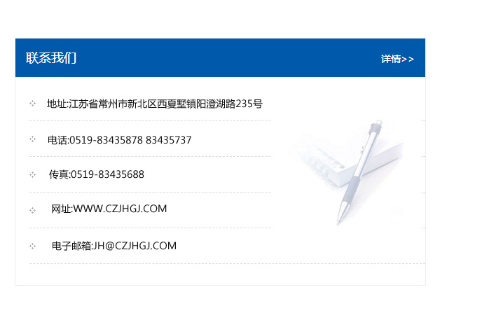 地址:常州市新北區友邦商務大廈1幢16、17層  電話:0519-85101652  傳真:0519-85112595  郵編:213022  網址:www_cz-jiayue_cn.zhenquancod.com  郵箱:xiajifengaa@163.com